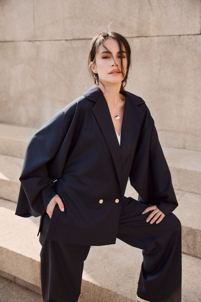 Sacou damă din 97% lână și 3% elastan cu mânecă largă și crăpătură laterală